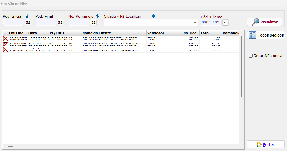 Na tela Emissão de NFe/NFCe, você poderá visualizar os pedidos que ainda não foram convertidos em nota fiscal.